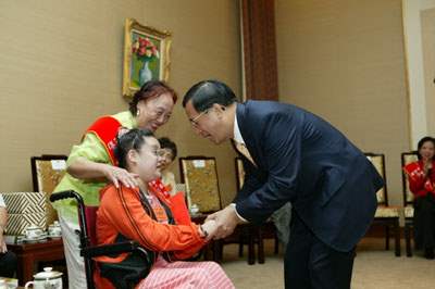 今天阿扁非常榮幸能與本屆「大愛獎」的得獎人和家屬晤面,在家庭觀念逐漸淡薄之際,「中華慈光愛心會」能賡續辦理這項表揚活動,今年已經正式邁入第八屆,意義至為深遠。這個獎項除了表彰身心障礙者尊長推己及人,將小愛化做大愛的偉大精神,更可以作為其他身心障礙家庭學習效法的標竿,同時對社會也有激勵人心向上的提昇作用,可以說非常難能可貴。在此,阿扁除了要感謝「中華慈光愛心會」長期以來對身心障礙朋友所付出的努力與貢獻,同時也要特別肯定我們最敬重的郭楊創會會長,每一次都參加總統接見的活動,更要感謝現任李理事長,由於你的卓越帶領,讓整個活動辦得越來越成功,當然更要向各位得獎人表達崇高的敬意與誠摯的祝賀。