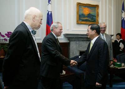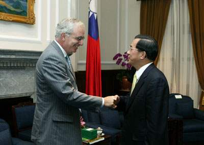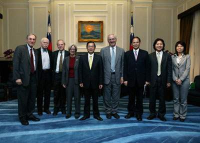 「新興民主的憲政改造—國際視野與台灣觀點」國際研討會與會外賓Bruce Ackerman等一行,上午由行政院研考會主委葉俊榮陪同,前來總統府晉見總統,總統府秘書長游錫堃也在座。