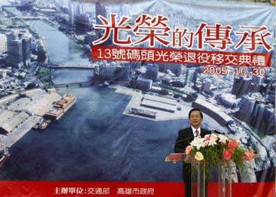 陳總統水扁先生今天上午主持「高雄港13號碼頭光榮退役移交典禮」,除應邀致詞外,也見證行政院謝院長將象徵該碼頭的光榮之鑰交給高雄市代理市長葉菊蘭,隨後三人並共同開啟光榮之鑰,啟動第13號碼頭的重新出發。