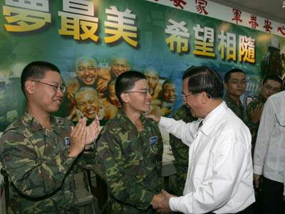 推動國軍現代化的轉型及強化台灣國防自我防衛能力是阿扁擔任中華民國總統和三軍統帥五年以來最念茲在茲的課題。特別我們面對的是一個在軍事上對台灣持續進行威脅恫嚇,以及在政治上以統戰手段企圖分化台灣內部團結的中共政權,在在突顯全體國軍弟兄以及全體國人同胞居安思危的重要性。