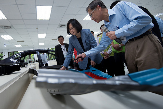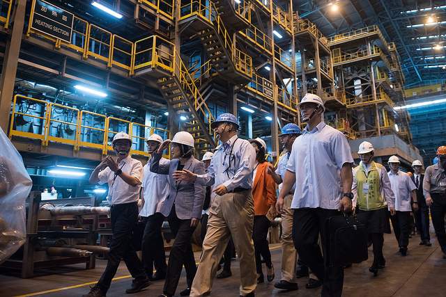 蔡英文總統今(16)日上午視察「中國鋼鐵公司」,聽取營運近況簡報、研發成果導覽,並在董事長翁朝棟陪同下,參觀中鋼第三冷軋廠的設備與產製流程運作。