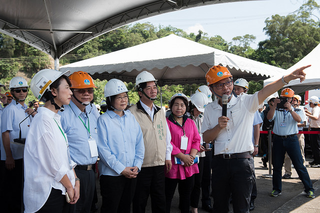 隨後,總統也前往白河水庫防洪防淤隧道口實地視察,瞭解透過「水環境建設」之推動,希望未來達成不缺水、不淹水、喝好水及親近水的願景。