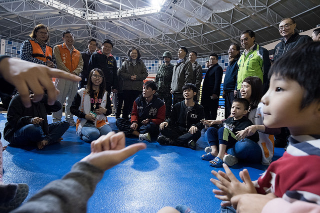 隨後,總統分別前往「花蓮中華國小」及「花蓮小巨蛋體育場」慰問收容鄉親。總統逐一詢問受災民眾地震發生時的情形以及他們的需求,為鄉親們加油打氣。她也相當關切安置民眾的起居以及物資是否充足,特別前往淋浴間瞭解淋浴機設備,以及收容中心的餐點熱飲等,希望能充分照顧災民的生活需求。總統也親切問候在現場服務的志工及社福團體,感謝他們對民眾的協助。