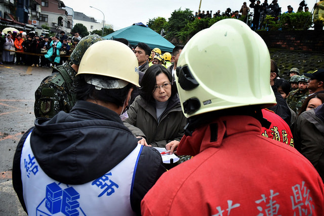 總統首先前往雲門翠堤大樓現場,聽取現場指揮官說明目前救災進度,同時也向我國搜救團隊及遠道從日本來的專家表達由衷謝意,期盼日本團隊帶來的技術與生命探測設備,與我國搜救團隊合作,共同找到生還者。