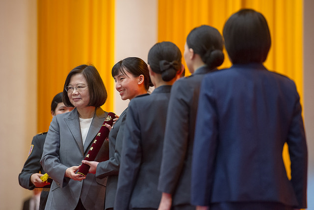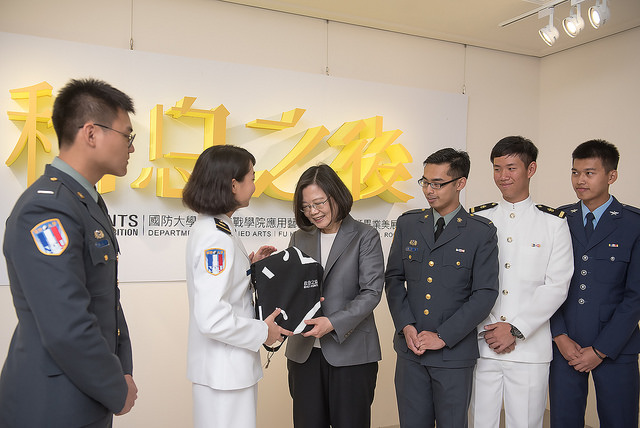 國軍的進步像是一場接力賽。在今天的畢業典禮之後,各位年輕畢業生也要準備起跑,接下國軍的光榮的棒子,繼續往前衝。在你們走出校門、踏入部隊後,請不要忘了今天,我對各位高度的期許。