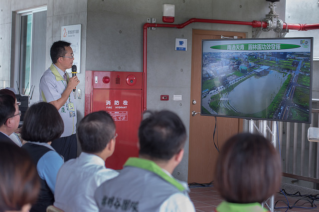 總統抵達後首先聽取簡報,隨後致詞時表示,7月2日的強降雨,彰化的圓林園滯洪池發揮成效,阻擋住淹水,令大家印象非常深刻。事實上,彰化在魏明谷縣長的執政之下,短短三年多,就將滯洪池從預算編列、規劃到興建完成,具體展現執政效率,值得肯定。