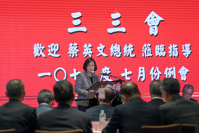 總統致詞時首先表示,「三三會」從成立以來,致力於推動策略聯盟,拓展對外經貿,為臺灣的經濟和產業的發展做出了很大的貢獻,她要向與會的各位產業界先進,致上最高的敬意。