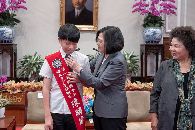 總統說,今天現場還有第一屆的「全國十大傑出青少年發明家」,看到同學們的發明介紹,每一項都是讓生活用品有更貼心的設計、使用起來更便利,她很佩服同學們的巧思和努力。她認為發明家需要十足的好奇心和堅強的毅力,同學們都具備這樣的條件,她恭喜得獎同學,也祝福他們未來在創造與發明的路上有更多成果。