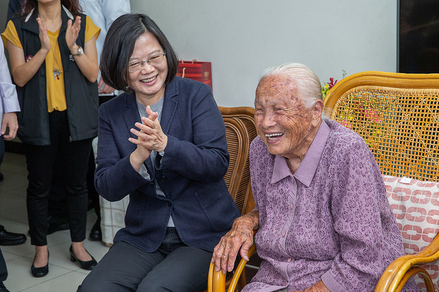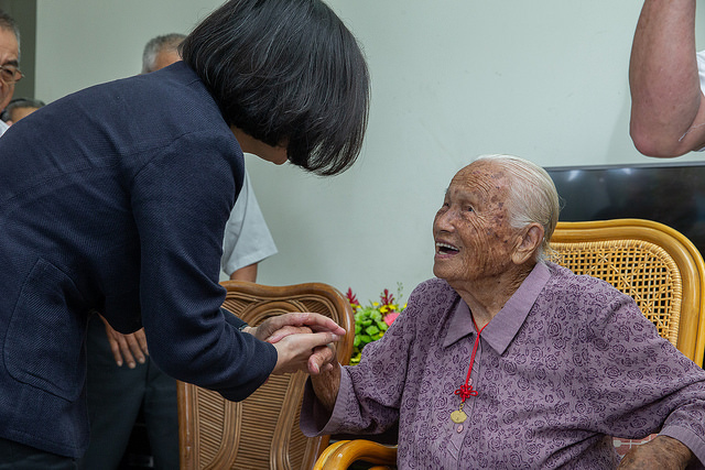 蔡英文總統今(12)日上午由衛生福利部次長呂寶靜、臺中市副市長張光瑤陪同,訪視臺中百歲人瑞邱張桂英女士。