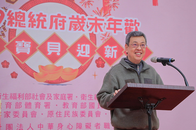 陳建仁副總統今(20)日下午出席由「社團法人中華身心障礙者職業技藝協會」於總統府南、北苑舉辦的「2019總統府歲末年歡 親親寶貝迎新春』」活動,與700多位低收入戶、寄養家庭、身心障礙、偏遠地區原住民、新住民及育幼機構的孩童同樂,以具體行動傳達政府愛護與照顧弱勢孩童的心意。