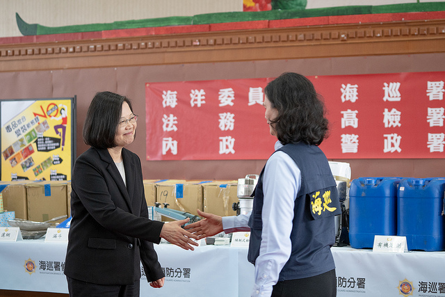 最後,總統再次向海巡人員以及所有第一線同仁致敬,由於他們在第一線的努力,臺灣的反毒工作、社會安全網才能越來越堅固。年前她曾提到警、消、軍、海巡是保障國家安全的「四大天王」,海巡人員的表現,全國人民有目共睹,政府一定會挺你們,不會讓大家孤軍奮戰。