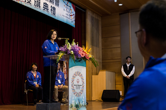 蔡英文總統今(5)日下午出席「2019年夏季世界特殊奧林匹克運動會中華臺北代表團授旗典禮」,肯定選手、教練、融合夥伴、志工在集訓過程中,彼此扶持,達到最完美的團隊默契,並盼選手們勇往直前,爭取勝利。