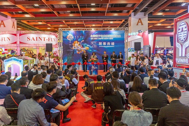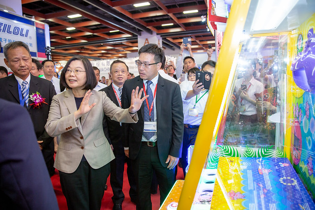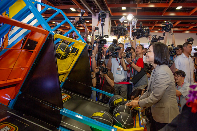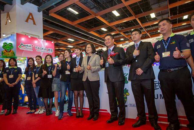 隨後,總統也與現場貴賓一同舉行剪綵儀式,並參觀攤位,體驗「傳奇射手籃球機」、「巨獸浩劫射擊體感機」、「深海魔獸遊戲機」等攤位遊戲。