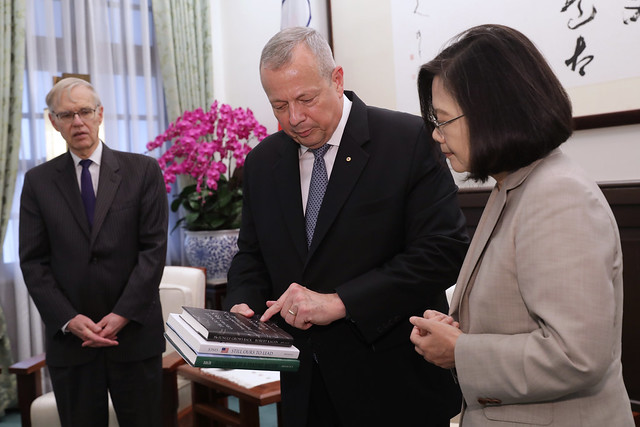 訪賓一行由外交部長吳釗燮陪同,前來總統府晉見總統,國家安全會議秘書長李大維也在座。