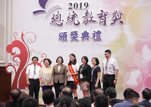 隨後,總統一一頒獎予獲獎同學。「2019總統教育獎」得獎同學包括國小組:蔡其翰、黃雨曦、謝依珊、鄭勝豪、華品禎、章羽珊、李品諭、江曉芳、張彧綺、陳美芳、章菀庭、鄧微微、陳千育、蘇漴瑋、羅柏勛、黃宥蓁、洪育琳、林宇涵等18名;國中組:劉宗翰、烏涵如、何彥寶、陳冠妤、廖婧妤、陳馨、許樂、樂政昀、謝玉涵、翁杏瑤、黃雅萱、林俊義、簡翠鳳、劉倖孜、廖紘緯、范欣怡、謝祥銨、陳女真等18名;高中職組:陳冠文、黃資翔、陳彩娟、葉麗娟、潘進富、王奕鈞、吳興明、林玄斌、林宇翔、謝孟恩、陳佑萱、魏呈瑋等12名;大專組:廖曼婷、呂豐和、許詠竣、宋沁、王明亮、張仕菁、王文彬、吳承嶸等8名。