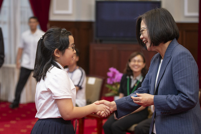 蔡英文總統今(1)日上午接見「中華民國第59屆全國中小學科學展覽會」各組(科)第一名師生時表示,108年新課綱當中所強調的「探究與實作」,正是大家在科展中所落實的精神。她期許同學們發揮自己的興趣與專長,共同為臺灣的產業發展注入更多創新的動能。