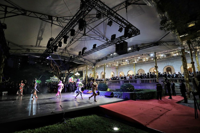 此次國慶酒會邀請「好聲音弦樂四重奏」、「精靈幻舞舞團」、「虎劇團」及「臺北爵士大樂隊青年樂團」分別進行音樂、佛朗明哥舞蹈及溜溜球、扯鈴等表演,蔡總統、陳副總統伉儷及卡培拉副總統及韋拉斯格斯副總統等亦前往水池舞臺區觀賞,現場氣氛熱鬧歡欣,主賓互動熱絡。