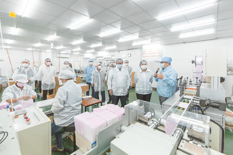 隨後,總統在易廷企業創辦人李輝雄等人陪同下,參觀口罩廠房,聽取新裝機臺介紹。