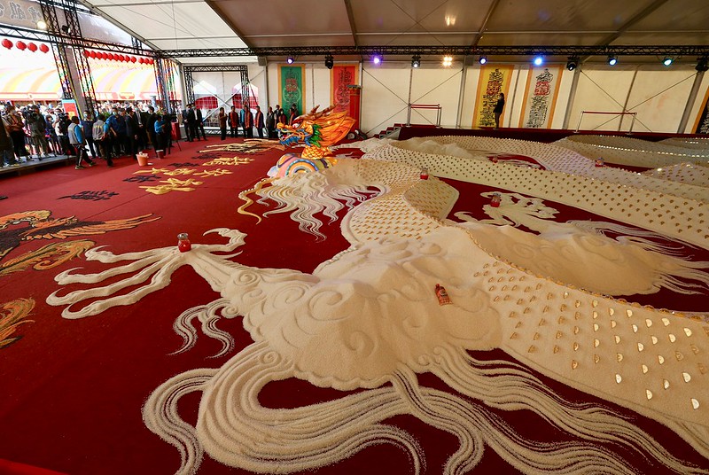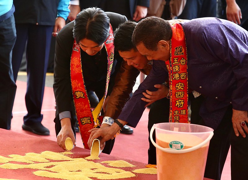 副總統接著說,他當過民意代表、地方首長以及行政院長等,參加過很多建醮,但這是第一次看到高達5萬公斤的米龍,以及鳳、獅、麒麟、貔貅等豆繪,從這裡都可以看出安西府廟方全體的用心良苦。