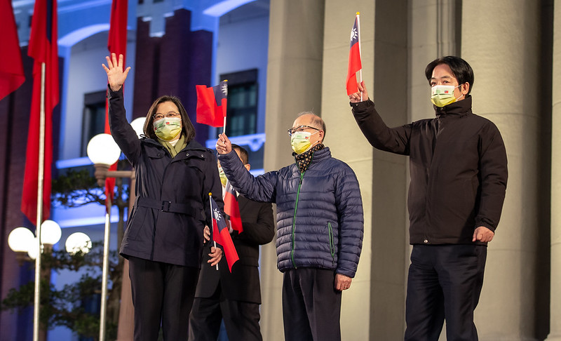 蔡英文總統與賴清德副總統今(1)日上午出席「中華民國110年元旦總統府升旗典禮」。總統與副總統抵達後,首先接受國防部三軍儀隊大隊長致敬,並在國軍基層楷模代表及扶輪社合唱團的領唱下齊唱國歌。