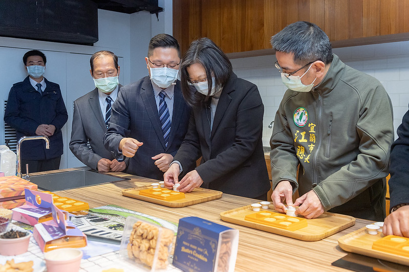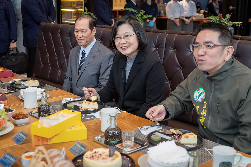 隨後,總統前往「超品起司烘焙工坊」參訪。首先聽取該工坊總經理王柏翔說明設立起源、理念及產品特色;隨後參觀賣場展售情形,以及宜蘭創新育成中心成員產品,並品嚐特色點心。