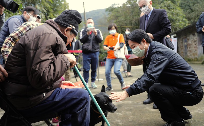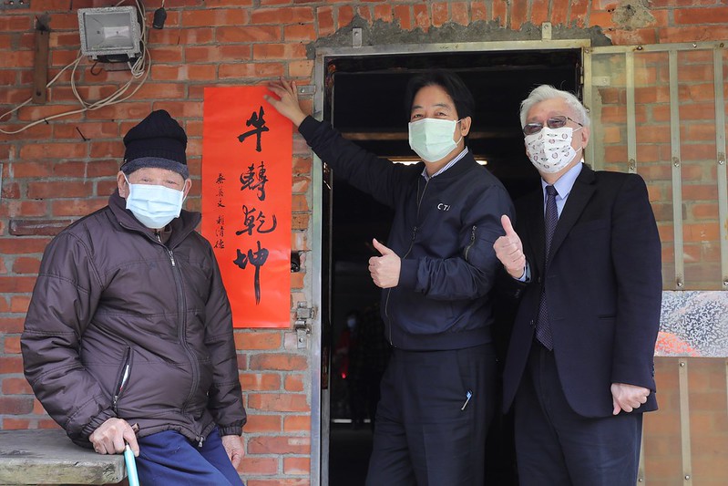 賴清德副總統今(25)日上午出席「迎接牛年 來趣金山作陣圍爐」活動,拜訪高齡99歲的蔡心婦及98歲的蔡江來有夫婦,與他們一起包水餃、圍爐及貼春聯,祝福他們新年快樂、身體健康,也提醒他們與家人平時要注意防疫保平安,並呼籲各界關心獨居弱勢長輩,協助長輩們能夠安心迎新年。