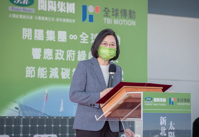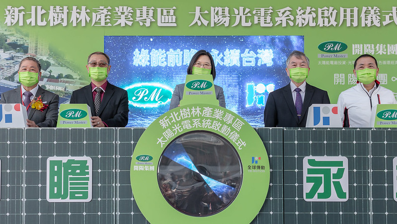 蔡英文總統今(23)日上午出席「新北市樹林產業專區太陽光電系統啟用儀式」時表示,綠能的發展代表臺灣實現能源轉型、追求永續發展的決心,同時也在布局下一個世代的產業競爭力,政府會協助企業一起達到使用綠電的目標,保持Made in Taiwan產品的優勢,也希望更多的企業,一起來加入設置光電的行列。