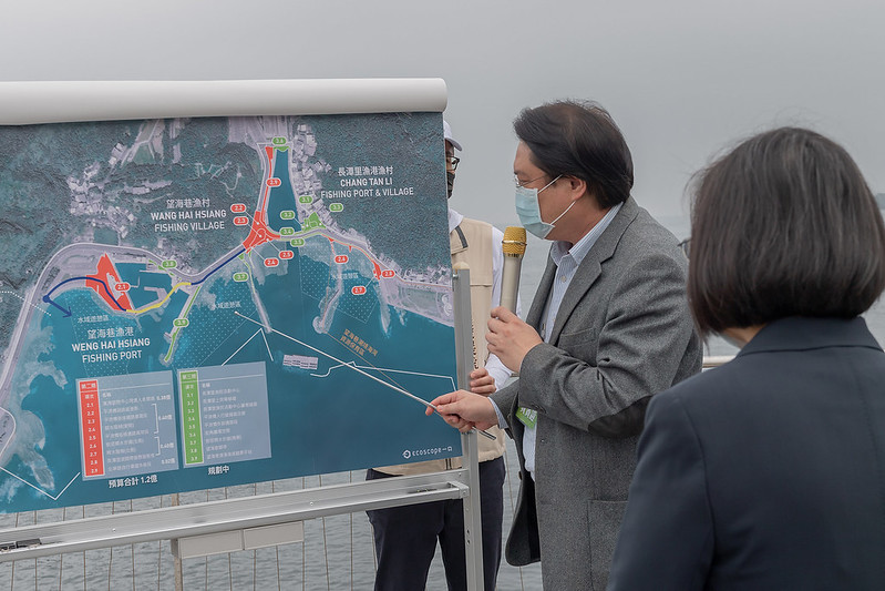 總統抵達後,先聽取基隆市長林右昌「望海巷海灣串聯計畫工程」簡報。之後致詞時表示,現在在的地方可以看到非常好看的景觀橋。八斗子有山、有海、有港口、有漁村文化,也有小朋友最喜歡的海科館。透過基隆銜接到新北的自行車道,可以吸引很多遊客。她有信心望海巷的跨海景觀橋未來將會是一個熱門的打卡景點。