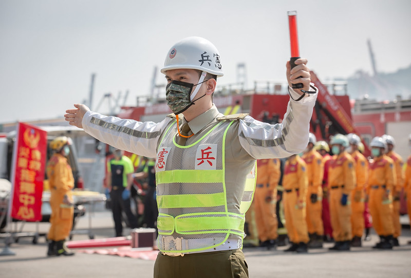隨後,總統校閱軍、警、消、醫護、市府同仁及民防單位,對參演人員面對各種災害的防救演練,表達肯定及慰勉之意。