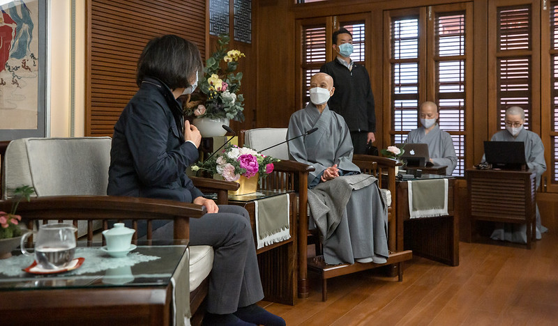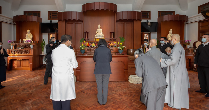 總統抵達後首先至大殿禮佛,隨後與證嚴法師、慈濟基金會副總執行長林碧玉、執行長顏博文、花蓮慈濟醫院院長林欣榮,以及慈濟大學校長劉怡均等人晤談。