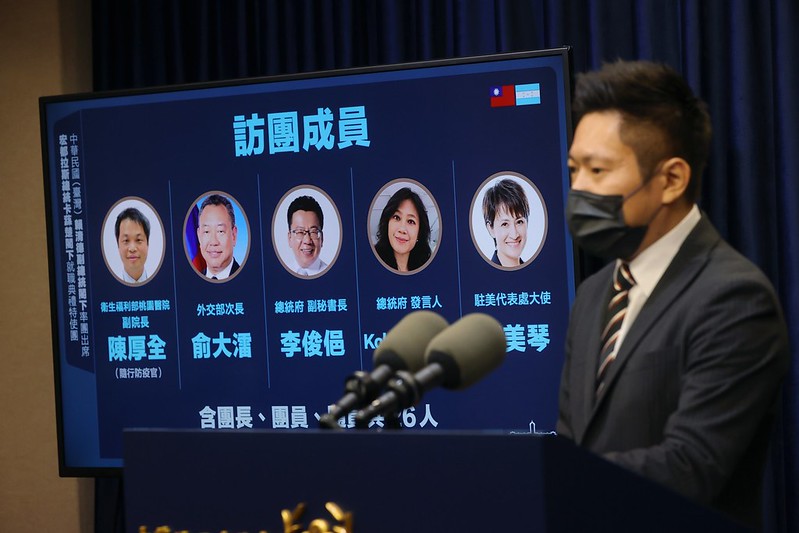 張發言人指出,此次特使團的團員包括總統府副秘書長李俊俋、外交部次長俞大㵢、駐美代表蕭美琴大使、總統府發言人Kolas Yotaka。除此之外,因應防疫考量,衛福部桃園醫院副院長陳厚全醫師也將隨團擔任防疫官工作。整個訪團包括團員、隨員、維安人員等,共計26人。