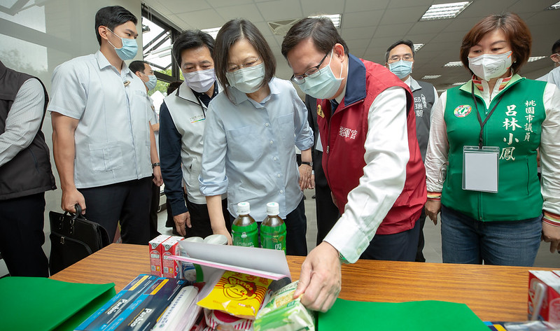 總統抵達後,由桃園市長鄭文燦、立法委員趙正宇陪同,參觀防疫關懷包的打包作業,並親自體驗防疫包物資裝填。隨後,總統也視察現場民眾領取關懷包情形,並聽取八德區長邱瑞朝說明防疫業務,以及桃園市資訊科技局局長余宛如簡報「市民卡作業系統」。
