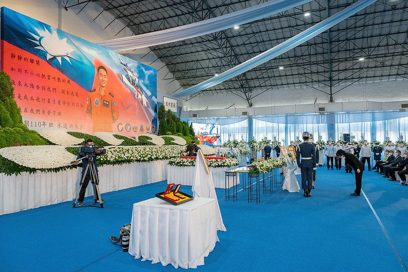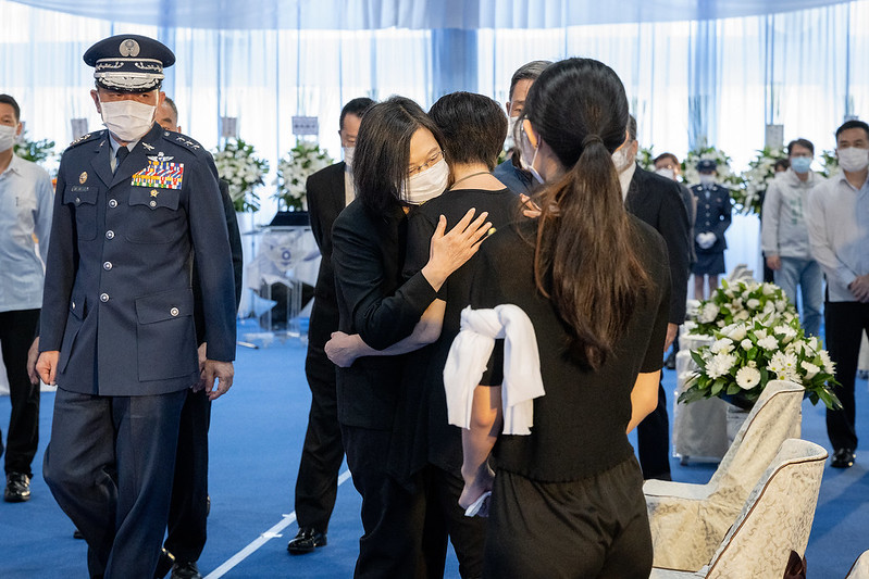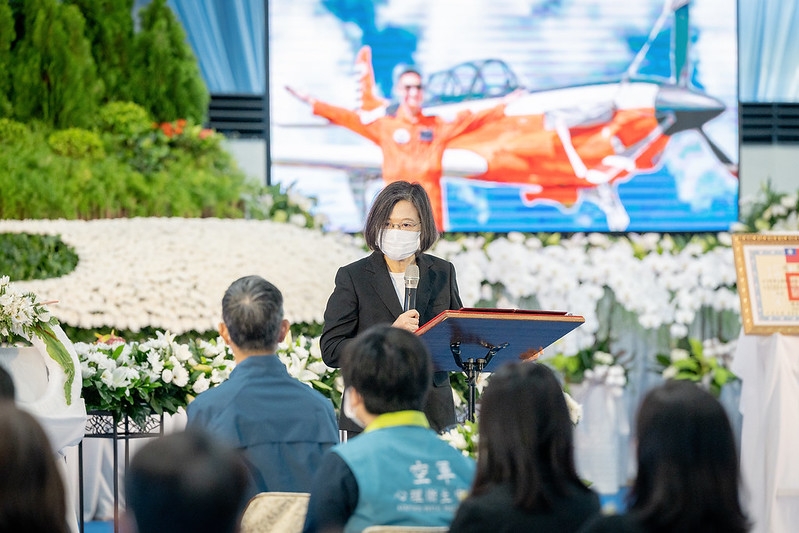 總統致詞時表示,上個月,徐大鈞上尉在執行飛行訓練時殉職,讓我們都非常傷痛不捨。今天,我們一起懷念大鈞,她也要代表國家,來謝謝大鈞。