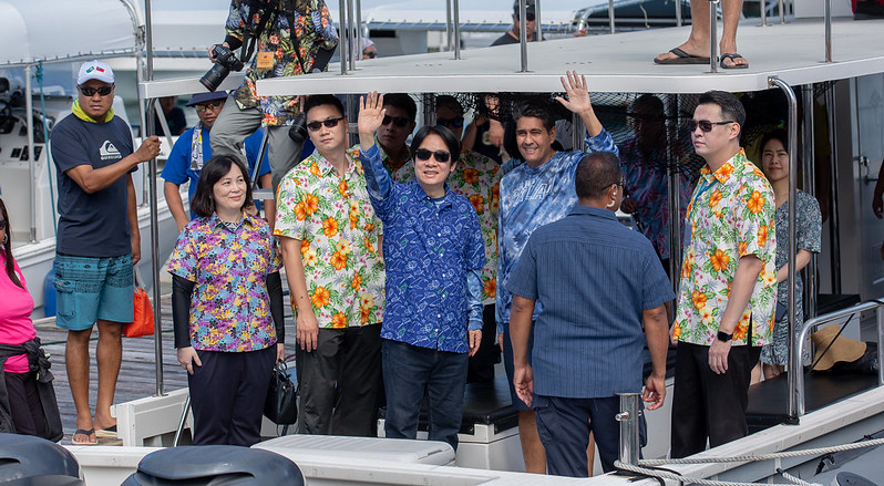 副總統自帛琉老爺大酒店碼頭登船,惠恕仁總統特別親自駕船陪同副總統見證帛琉的海洋觀光魅力,副總統也在船上親自體驗掌舵航行。