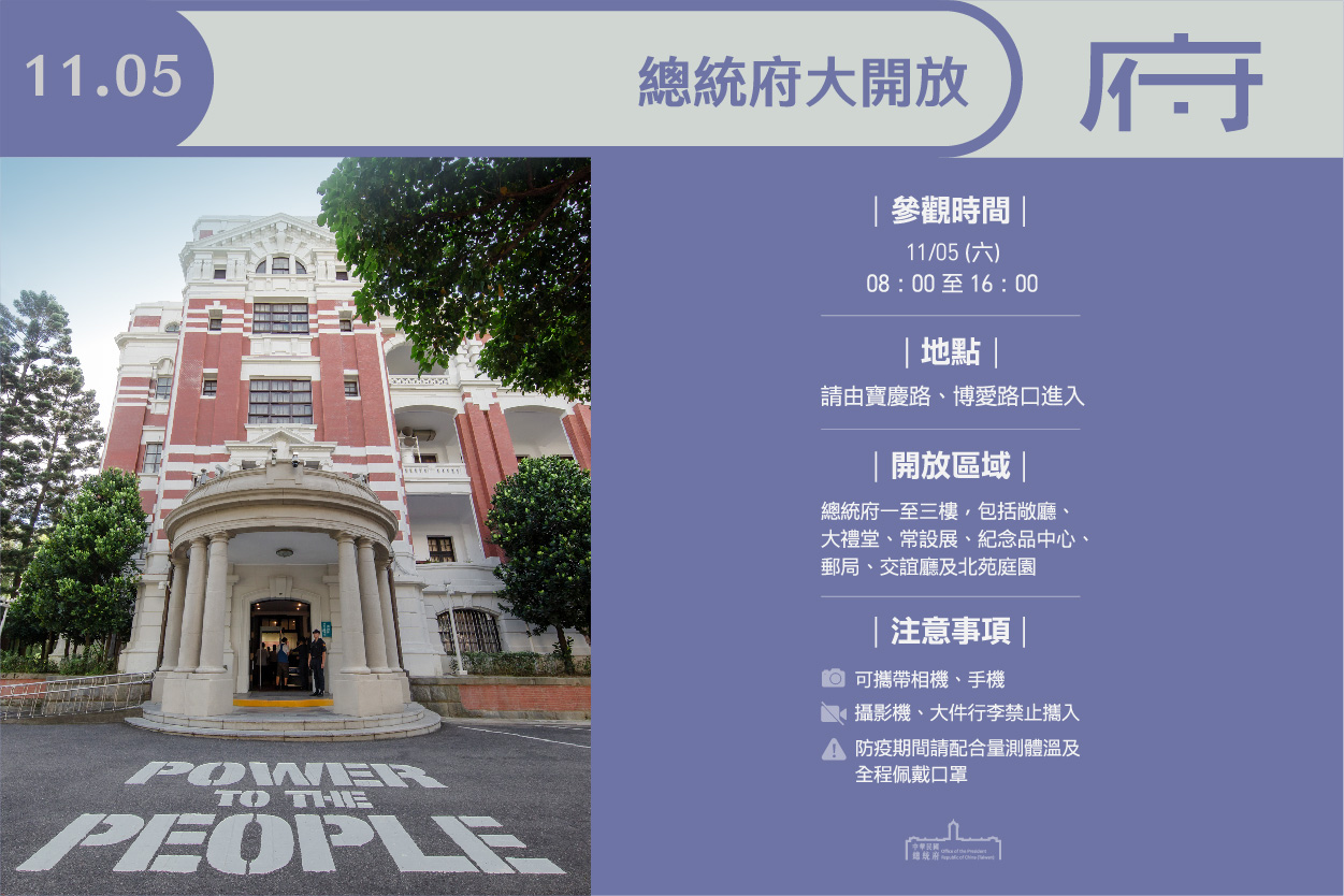總統府11月5日(週六)上午8時至下午4時開放參觀,開放區域為總統府一至三樓,包括敞廳、大禮堂、常設展「府-建構」、「府-日常」、「府-聲音」、「府-遇見」、「府-時代」、「府-想像」、「府-印象」及「府-我在」、郵局、交誼廳、紀念品中心及北苑庭園。