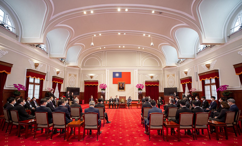 訪賓一行由行政院公共工程委員會副主任委員顏久榮陪同,前來總統府晉見總統,總統府副秘書長黃重諺也在座。