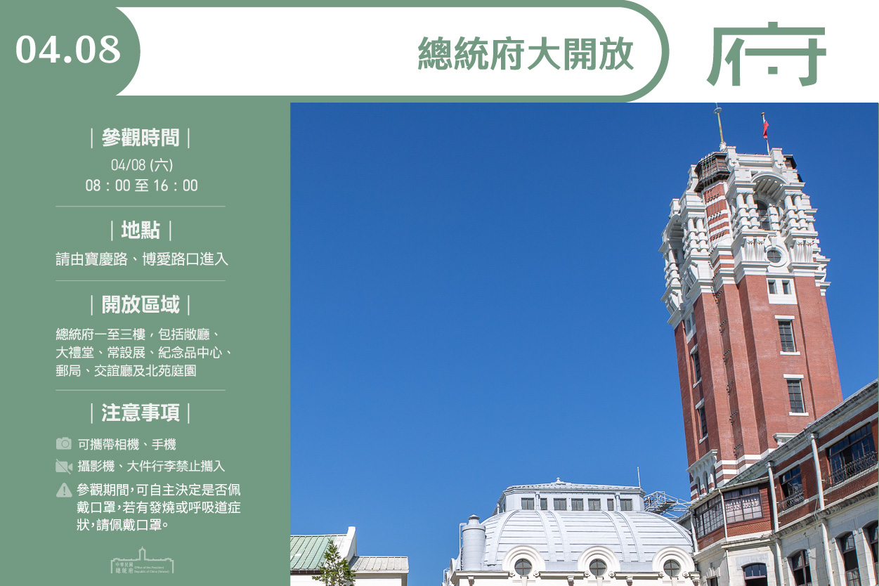 總統府4月8日(週六)上午8時至下午4時開放參觀,開放區域為總統府一至三樓,包括敞廳、大禮堂、常設展「府-建構」、「府-日常」、「府-聲音」、「府-遇見」、「府-時代」、「府-想像」、「從客家看臺灣,從臺灣看世界特展」、「府-印象」、「Kemasi Maza立足臺灣,連結南島特展」及「府-我在」、郵局、交誼廳、紀念品中心及北苑庭園。