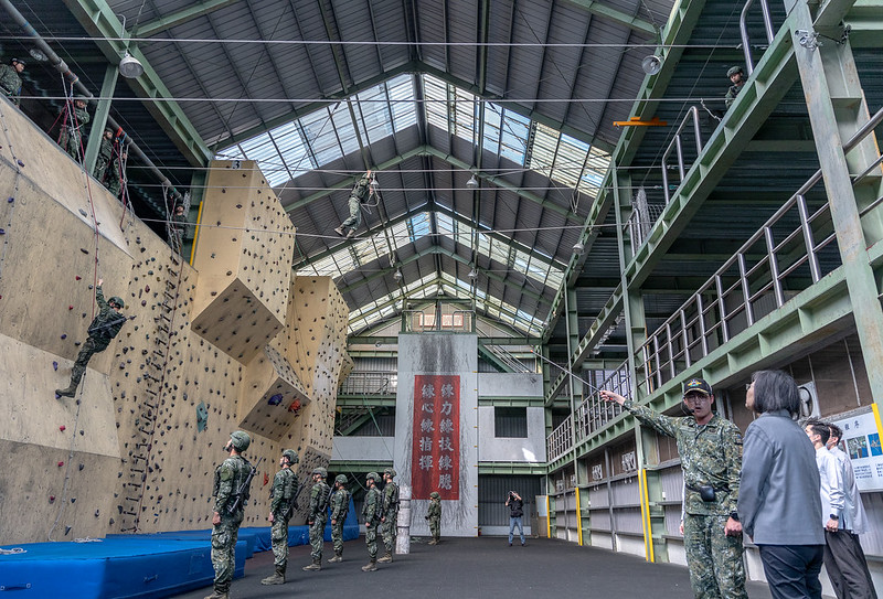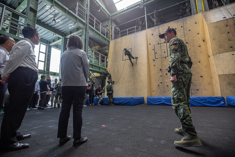 總統抵達後,先後聽取「專案部隊訓練-快速繩降」、「特戰基礎班隊訓練-繩索下降及通過突擊吊橋、絕壁攀登及平衡攀登」說明。最後頒發加菜金,感謝官兵們的辛勞付出。