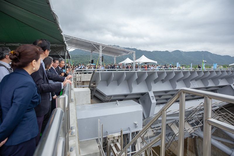 隨後,總統與現場貴賓一同進行剪綵儀式及合影,並於現地聽取賴建信署長解說該工程全國最寬弧型閘門特色。
