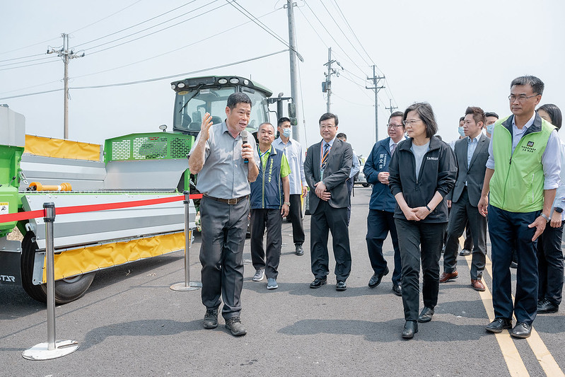 總統抵達後,首先在虎尾科技大學教授戴守谷介紹下,參觀農機具、無人機展示區,及聽取「馬光有機集團栽培區發展及規劃」簡報,並視察動態農機展示「雷射整平儀」。