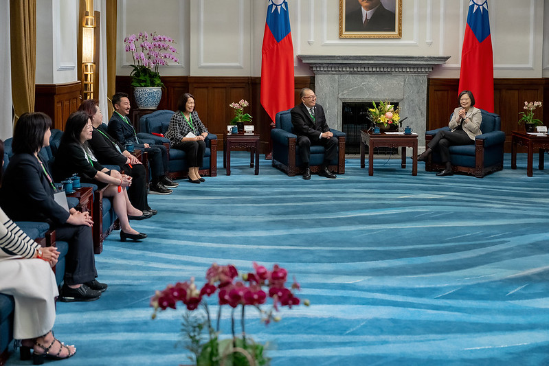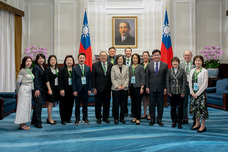 訪賓一行尚包括僑務委員暨紐約臺灣商會名譽會長江俊霖、北美洲臺灣商會聯合總會秘書長温玉玲等,由北美洲臺灣商會聯合總會總會長吳東昇率領,僑務委員會委員長徐佳青陪同,前來總統府晉見總統,總統府秘書長林佳龍也在座。