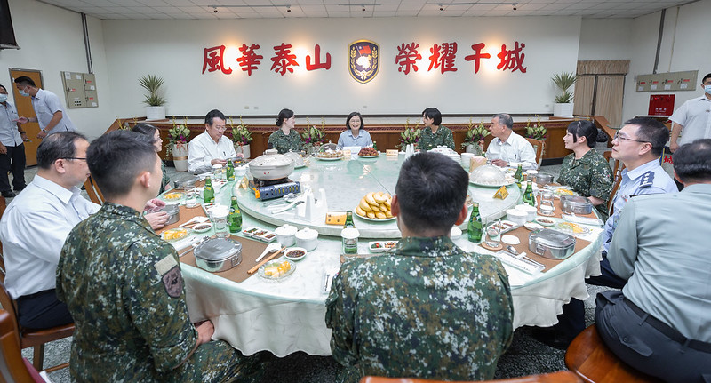 蔡英文總統今(9)日上午前往高雄勗勉「空軍防空暨飛彈指揮部暨南部區域作戰管制中心」及「陸軍八軍團指揮部」,除聽取部隊相關任務簡報,也與在空機飛行員及飛彈連連長分別進行戰備通話。午間,與重要幹部及官兵代表會餐,並至各桌慰勉官兵辛勞。