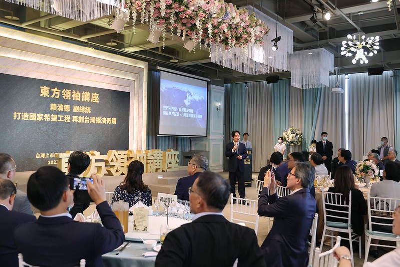 賴清德副總統今(6)日下午出席「台灣上市櫃公司協會『東方領袖講座』」,以「打造國家希望工程 再創台灣經濟奇蹟」為題進行演講。他指出,將以數位轉型和淨零轉型為動力的「雙軸路線」,投資創新、投資人才,以發展智慧永續的新臺灣,讓臺灣再創「包容成長」、「綠色成長」的新經濟奇蹟。