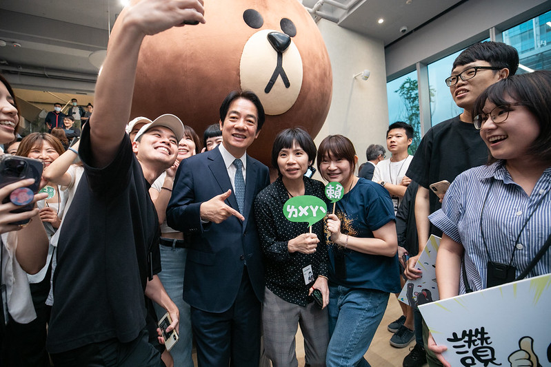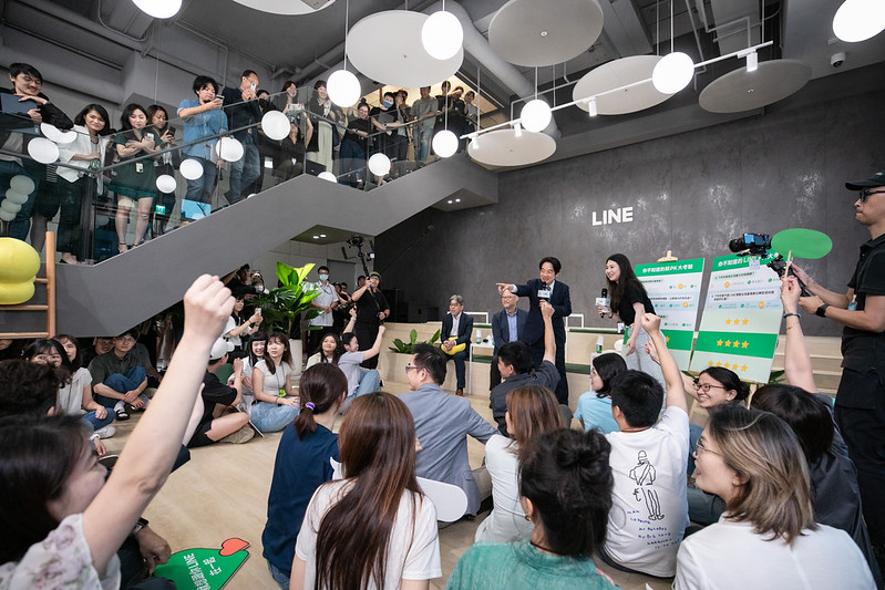 隨後,副總統至一樓大廳與LINE在台員工互動,進行問答遊戲,現場氣氛熱鬧歡愉。