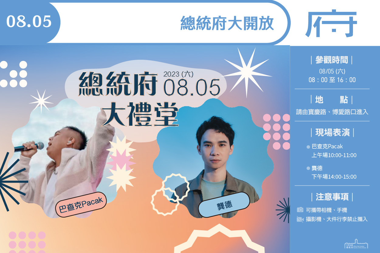 總統府8月5日(週六)上午8時至下午4時開放參觀,開放區域為總統府一至三樓,包括敞廳、大禮堂、常設展「府-建構」、「府-日常」、「府-聲音」、「府-遇見」、「府-時代」、「府-想像」、「從客家看臺灣,從臺灣看世界特展」、「府-印象」、「Kemasi Maza立足台灣,連結南島特展」、「府-我在」、郵局、交誼廳、紀念品中心及北苑庭園。