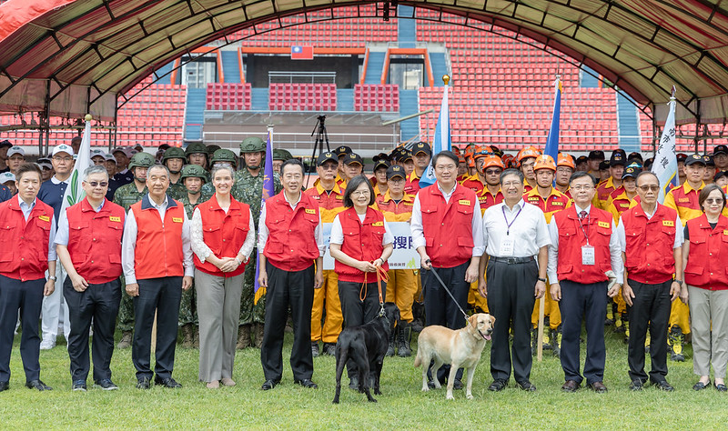 總統說,剛才我們看到各單位都展現出平時訓練的成果,她要感謝大家的努力和付出以及各個民間團體的支持和協助。像是慈濟,就如同過去深入災區為災民服務,今天也提供重要的支援。還有「壯闊台灣聯盟」和「美國精神(SPIRIT OF AMERICA)」,共同培訓兩支民間自主緊急應變隊,在今天的演練中展現第一線救災的戰力。