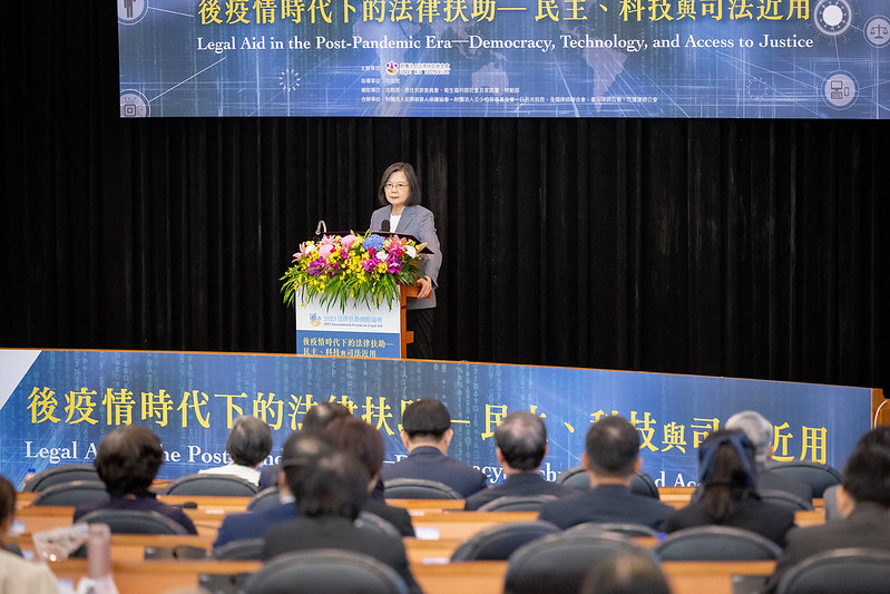 總統首先表示,感謝法扶基金會第5次舉辦國際論壇,邀集國內外專家學者一起針對當前世界情勢發展,討論許多重要的法律議題,特別是法律援助議題。她也特別感謝與會貴賓從各地遠道而來與我們共襄盛舉。