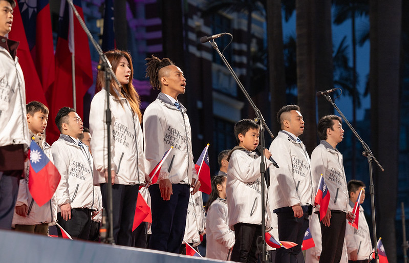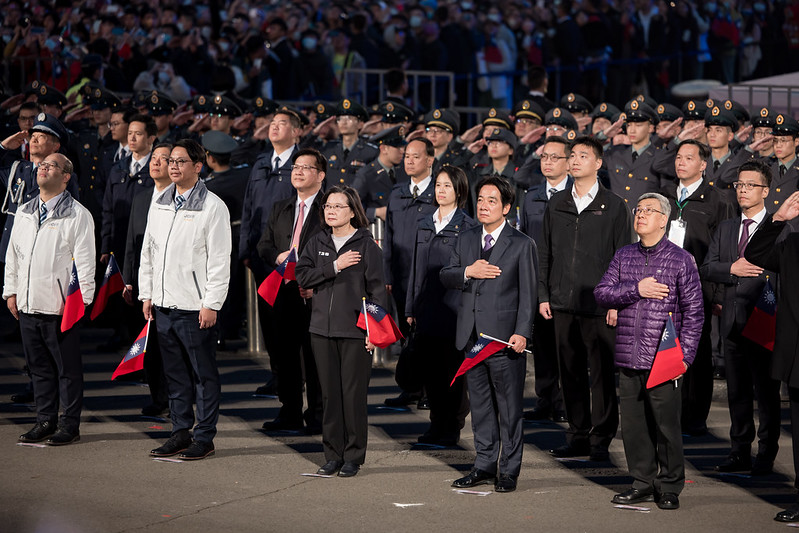 蔡英文總統與賴清德副總統今(1)日上午出席「中華民國113年元旦總統府升旗典禮」。總統與副總統抵達後,首先接受國防部三軍儀隊大隊長致敬,並在歷屆十大傑出青年代表的領唱下,與現場民眾齊唱國歌。國旗隨後也在國旗歌演奏聲中緩緩升起。