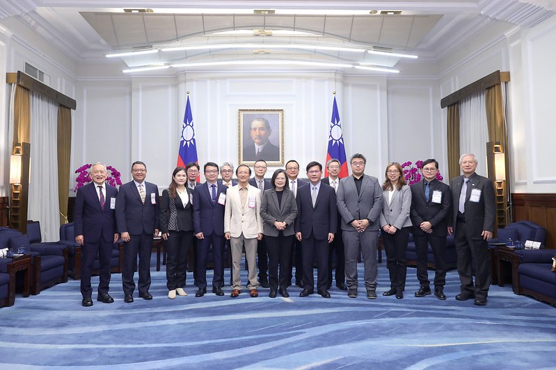 訪賓一行由台北市電腦商業同業公會榮譽理事長童子賢、資訊月活動委員會主任委員劉瑞復率領,數位發展部次長李懷仁陪同,前來總統府晉見總統,總統府秘書長林佳龍也在座。
