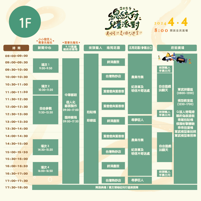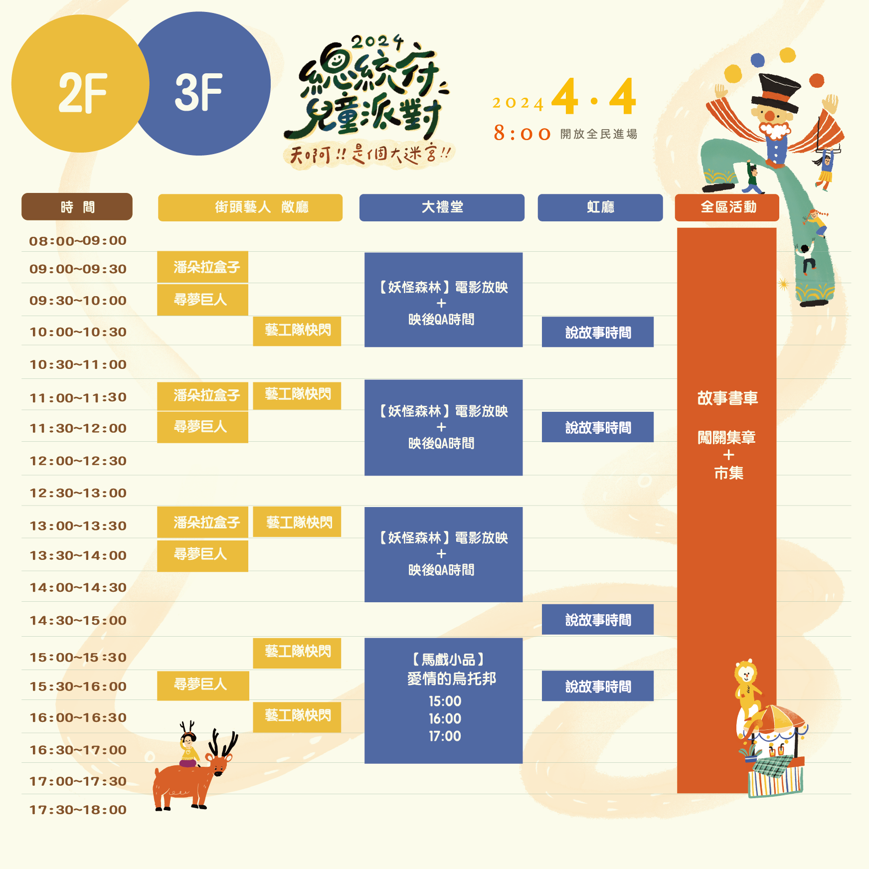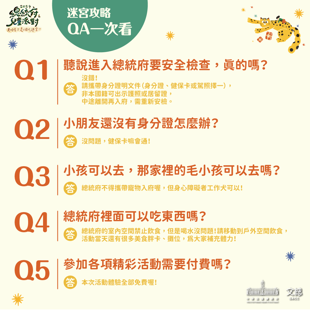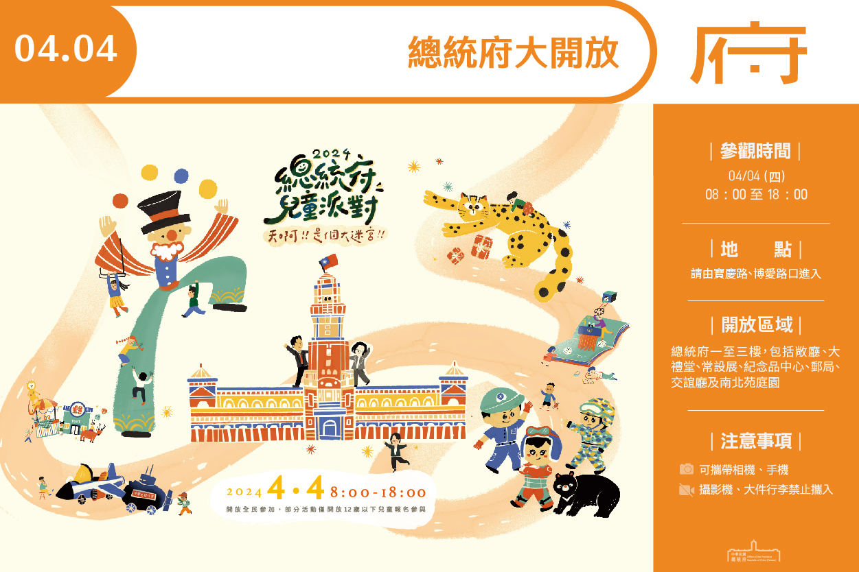 總統府4月4日(週四)當日與中華文化總會結合兒童節與假日大開放活動,舉辦「天啊!是個大迷宮」2024總統府兒童派對,自上午8時至下午5時30分開放參觀。本次活動包括有闖關集章、童玩及軍武遊戲體驗、街頭及快閃表演、農業與親子市集、美食胖卡、說故事與閱讀角、故事書車、《妖怪森林》動畫電影放映、幼兒園樂旗隊表演、臨時郵局等多項活動,歡迎大小朋友來總統府,共同創造小朋友快樂的童年回憶。兒童派對活動相關資訊會持續於總統府發言人臉書、總統府LINE帳號、中華文化總會網站及臉書等發布,歡迎民眾追蹤關注,獲得活動最新資訊。